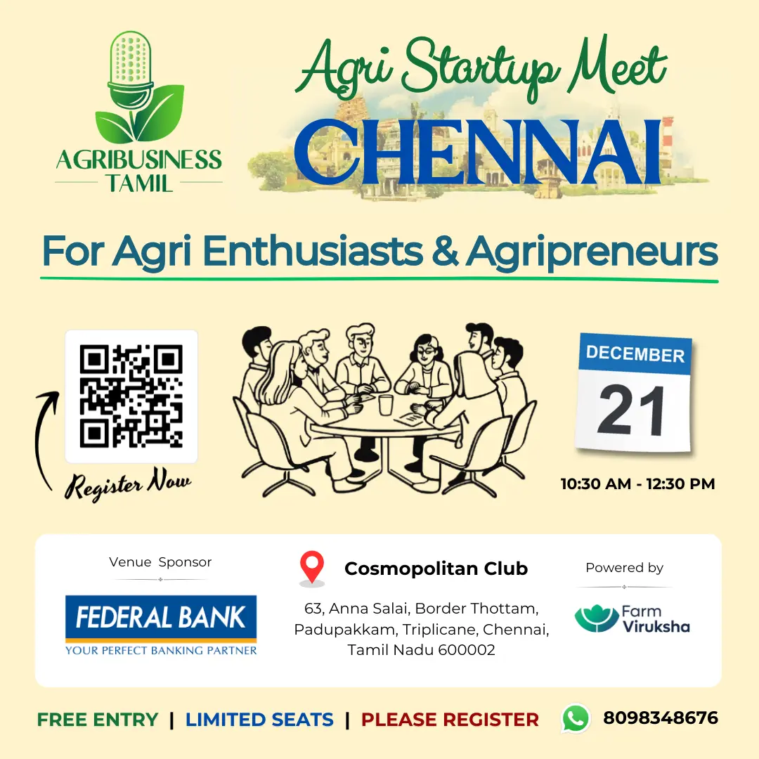 Are you passionate about agribusiness ? Join us in Chennai for an exclusive networking event, designed for aspiring and experienced agripreneurs and agricultural enthusiasts.